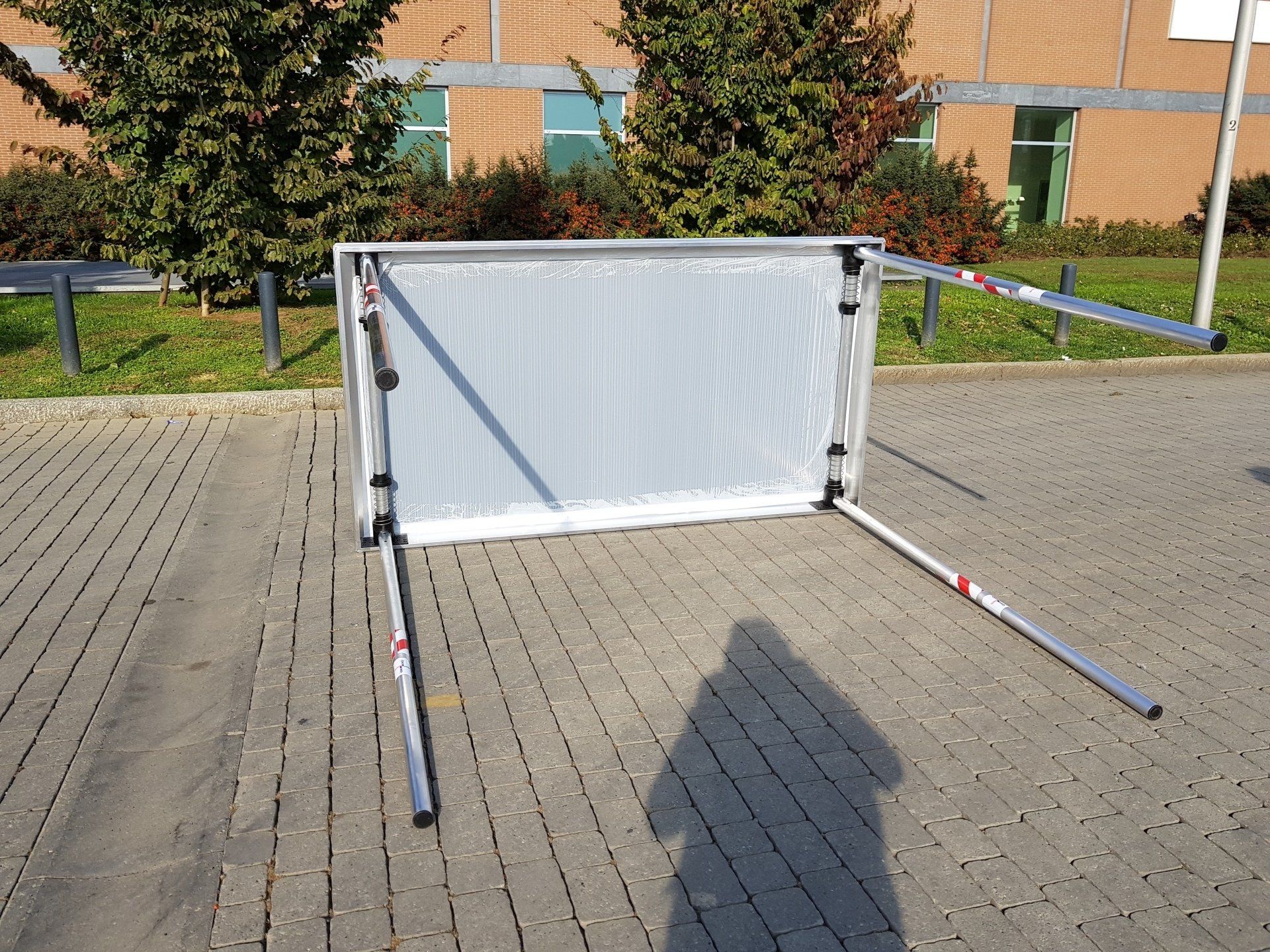 Montare il tunnel pedonale Genius è semplice e veloce. Basta aprire i 4 sostegni telescopici, sfilare il tubo inserito all'interno e regolare l'altezza desiderata. Il tutto in meno di 1 minuto ! Non servono attrezzi, ogni singolo modulo dal peso di solo 30,5 Kg. può essere posizionato rapidamente anche da una sola persona. Si possono così creare velocemente diversi percorsi di sicurezza ottimizzando tempi e costi.