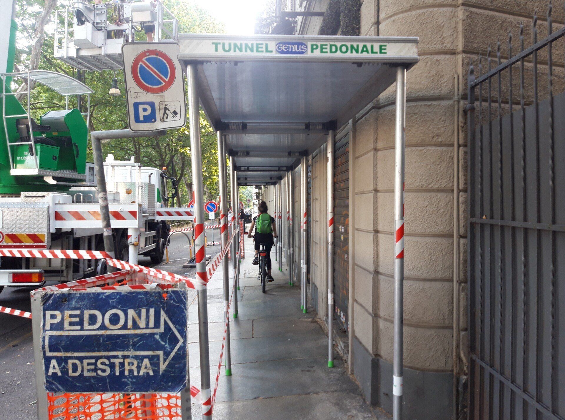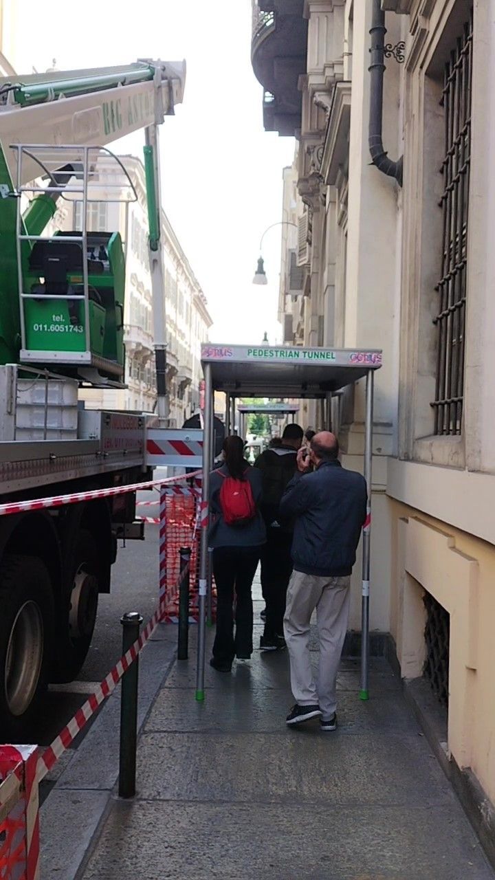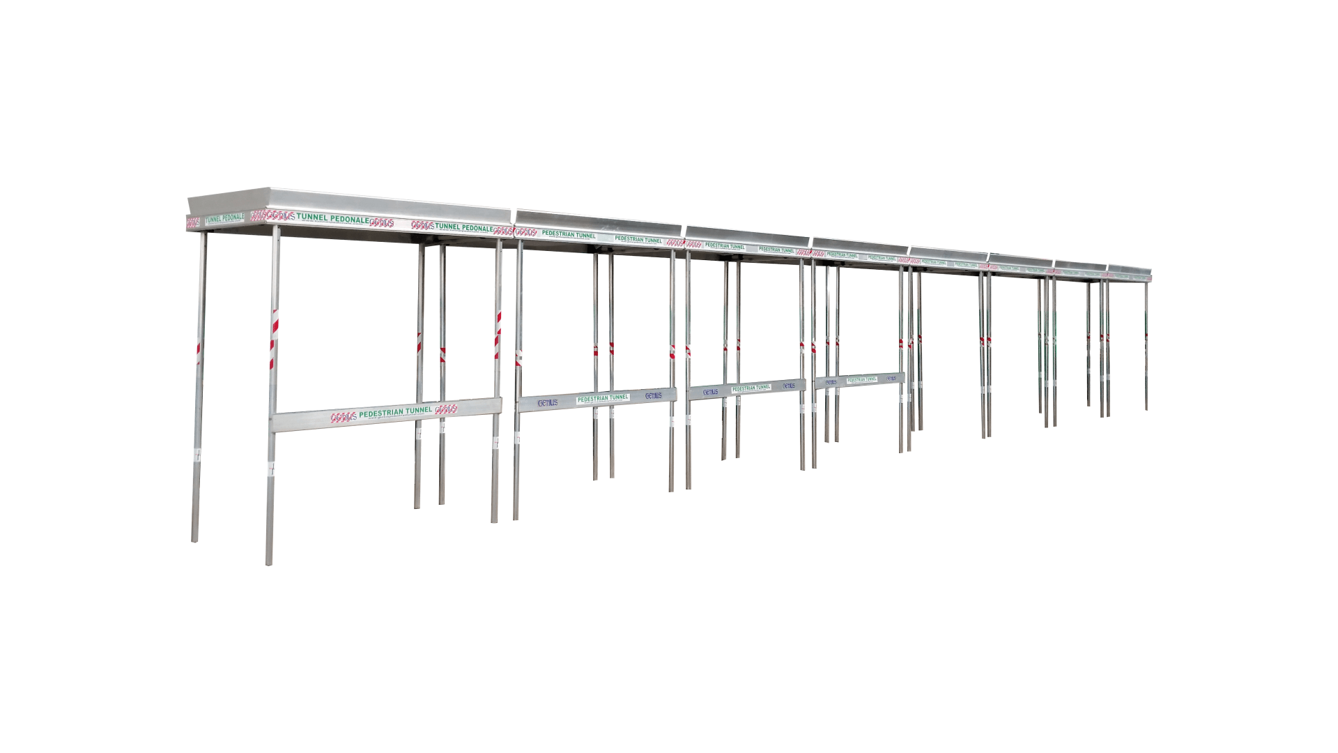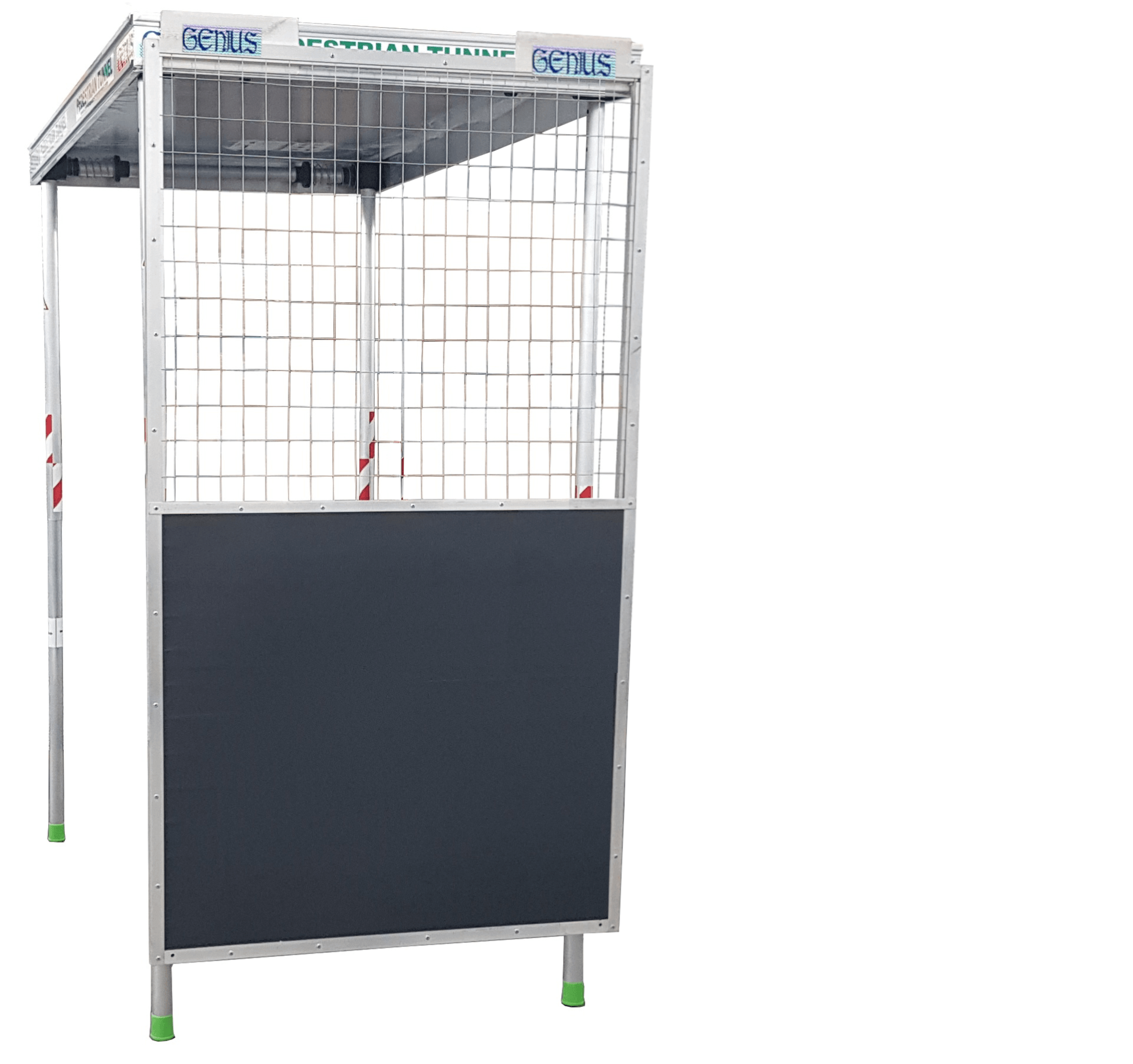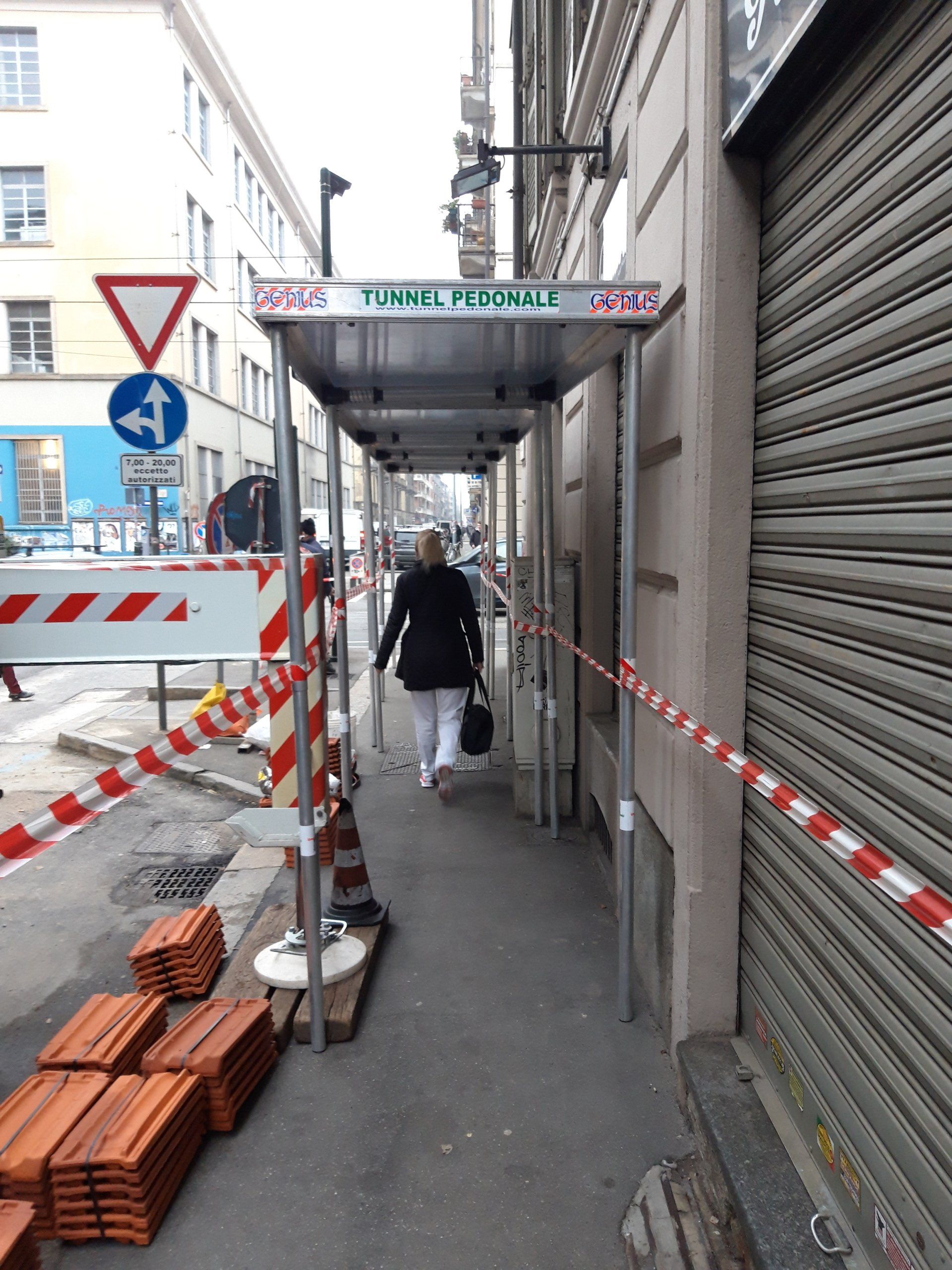 Fino a qualche tempo fa la protezione dei pedoni in caso di cadute accidentali dall'alto di materiale vario durante l'esecuzione di lavorazioni eseguite in quota era affidata a soluzioni complesse e dispendiose. Molte volte risultava purtroppo necessario perfino chiudere i marciapiedi e tale procedura causava notevoli disagi ai negozianti e ai pedoni stessi costretti ad attraversare la strada in punti non regolati da strisce pedonali. Oggi grazie al Tunnel pedonale Genius tutto è molto più semplice, sicuro e veloce !